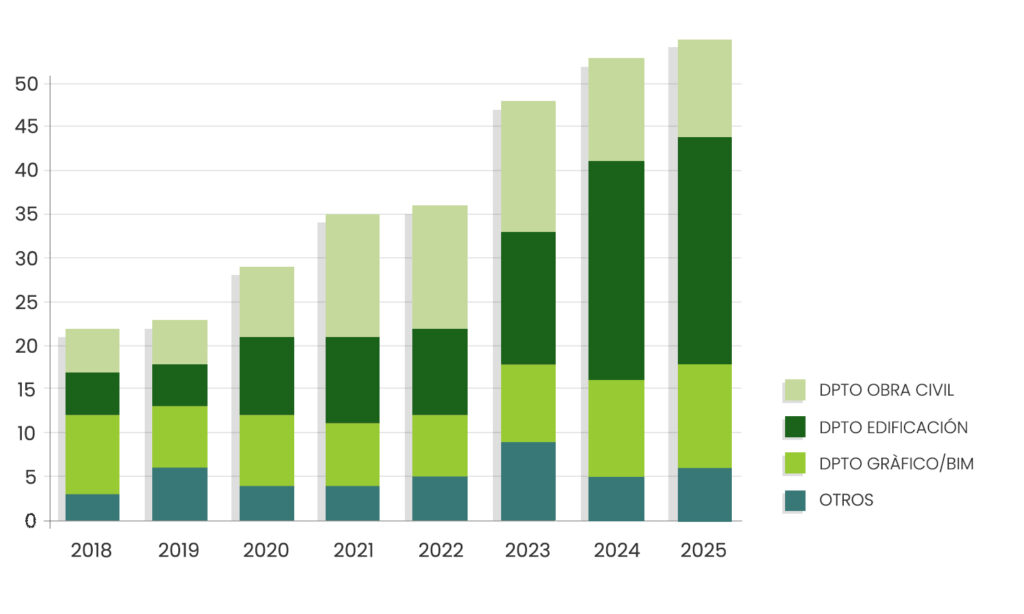 Estos técnicos están repartidos en 3 Equipos destinados exclusivamente a Documentaciones Técnicas de Edificación, 2 Equipos de Documentaciones Técnicas de Obra Civil y un equipo exclusivo para Planos e Infografías 3D de los procesos de ejecución.