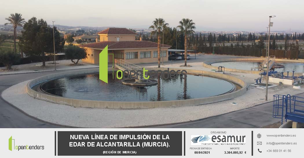 Nueva licitación de ESAMUR: Nueva línea de impulsión en la EDAR de Alcantarilla (Murcia), por 3,30 M€. Entrega: 08/04/2021.